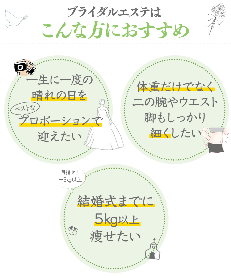 効果については個人差があるため、一概には言えません。ブライダルエステコースをご希望される方も、コースを体験することができますので、一度体験していただき、ご自身で効果を実感されてからエステを決めることをおすすめします。